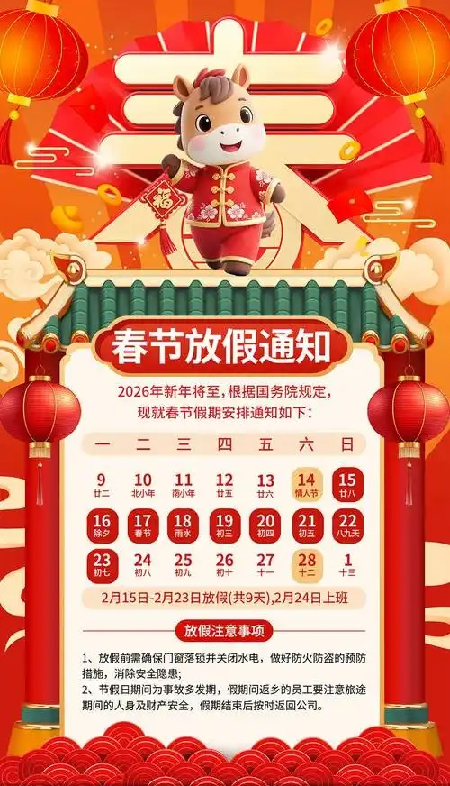 2026年2月15日(農(nóng)歷臘月二十八,周日)至2月23日(農(nóng)歷正月初七,周一),共9天。